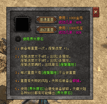 终极涅槃属性在后续重置中不会被清除,使得单件装备具备长期培养价值,而非短期消耗品。与此同时,涅槃重置存在失败风险,失败后装备将直接破碎。界外原石的加入,为高阶装备提供了保护选择,使修炼者在追求极限属性时需要在风险与收益之间作出权衡。