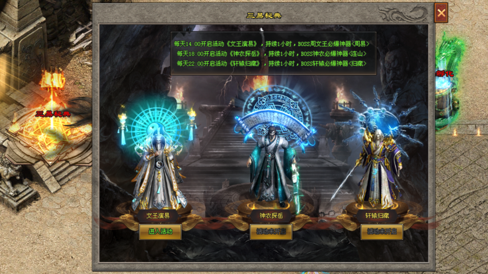 - 三易秘典:每日三场限时活动,BOSS必爆神器或异兽蛋,活动期间人气爆棚。