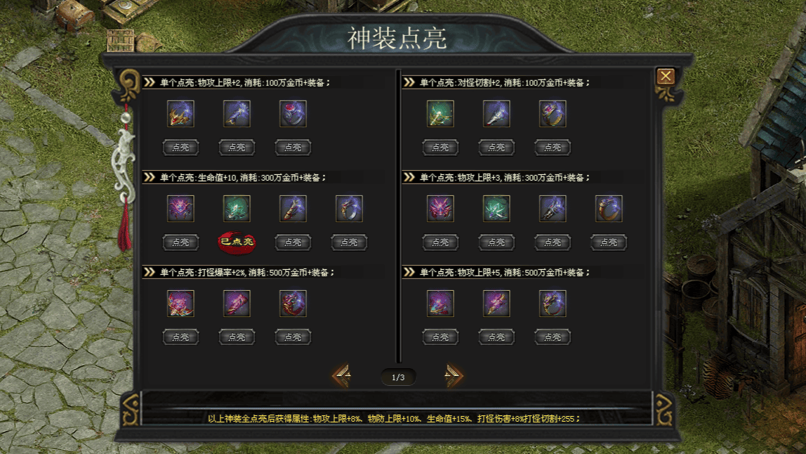 - 神装点亮:通过点亮装备获得攻击、防御、生命与切割永久加成。