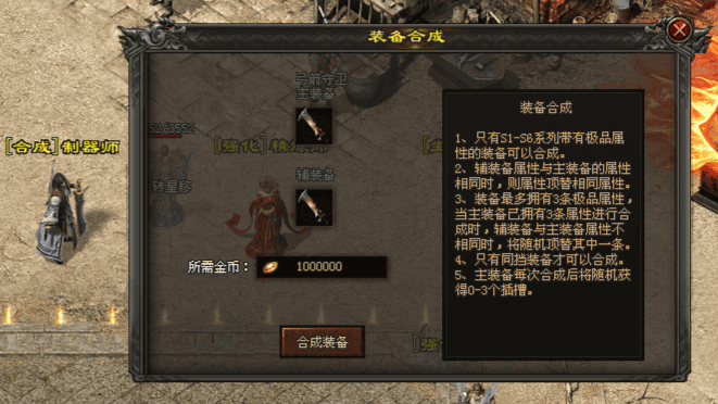 在此基础上,版本引入装备合成系统作为长期成长的关键支点。修炼者可在安全区的合成制器师处,对带有极品属性的S系列装备进行合成升级。合成后主装备将继承辅装备属性,并随机获得插槽,为后续深度打造预留空间,使装备具备持续进化的可能。