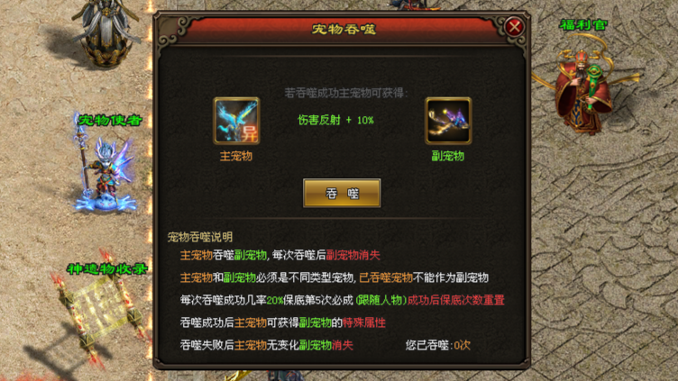 宠物吞噬系统为玩家提供额外成长空间。橙宠具备骑乘与属性双加成,可吞噬副宠获得随机能力,五次必定成功。宠物图鉴能提升生命、防御、暴击等基础属性,所有宠物均可分解为碎片,用于兑换高阶宠物。