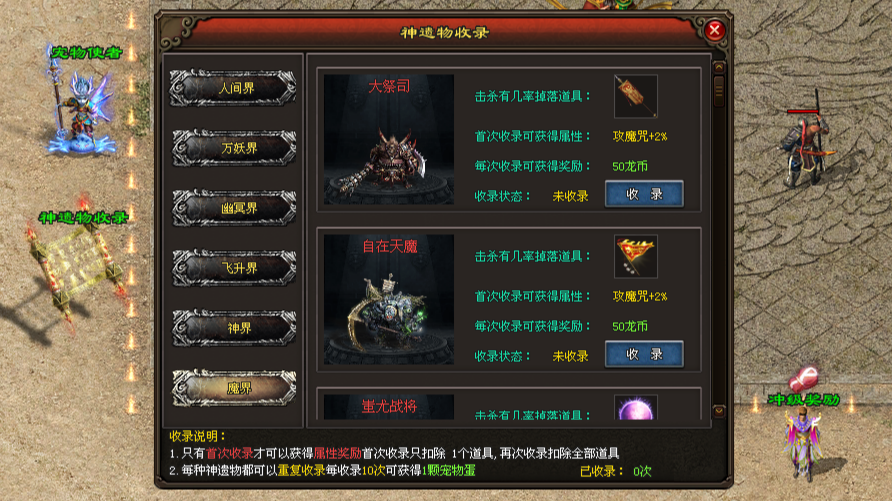 神遗物收录系统则延展了长期养成路线。收录遗物可获得攻击、防御、生命加成,并周期性产出龙币与宠物蛋,是稳定经济循环的重要环节。