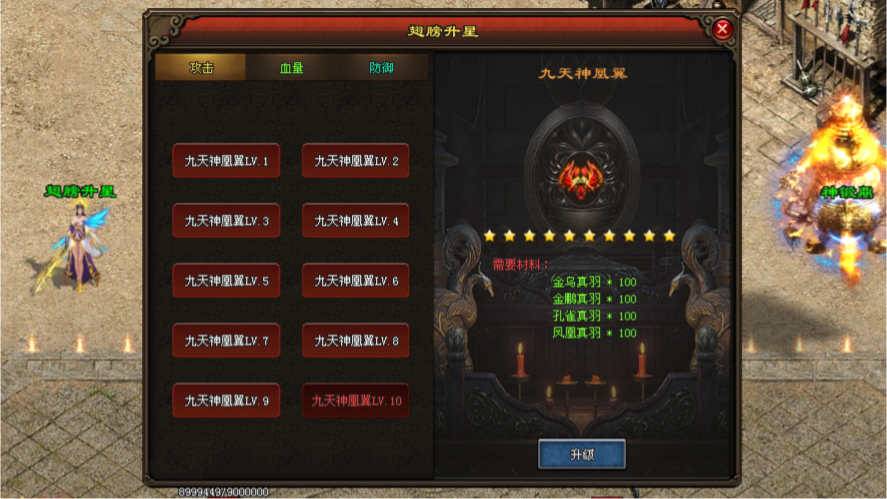 同时,翅膀升星系统让角色外观与属性兼修。九天神凰翼、裂空龙鳞翼、焚天朱雀翼三种方向各具特色,最高可升十星。