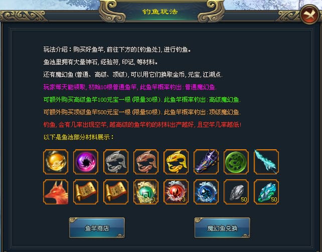 - 主城的神途钓鱼玩法每天必做,免费鱼竿可收获材料与货币,还有机会获取稀有装备。