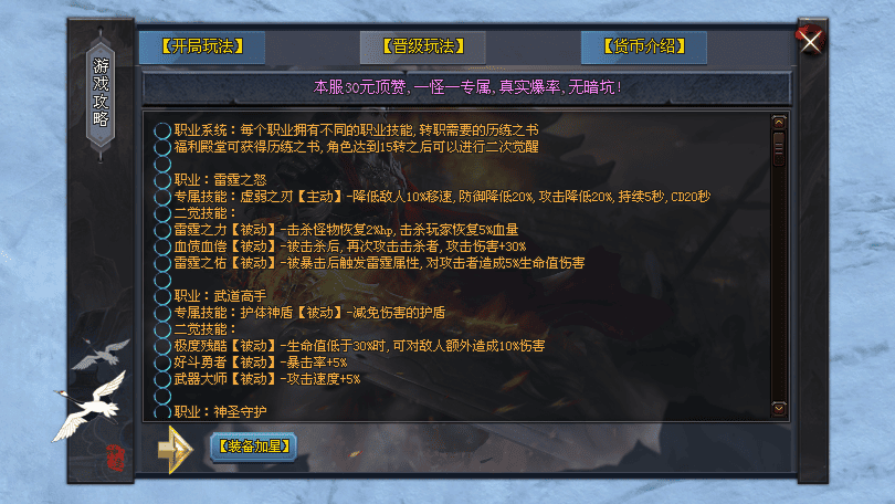 - 觉醒系统:每个职业可在觉醒祭坛进行觉醒,首次觉醒提升全属性10%,并解锁专属技能;二次觉醒后获得额外被动与光效。